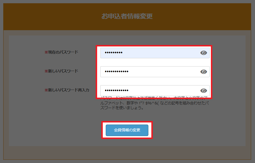 現在のパスワードと変更後のメールアドレスを入力し、会員情報の変更ボタンをクリックします。