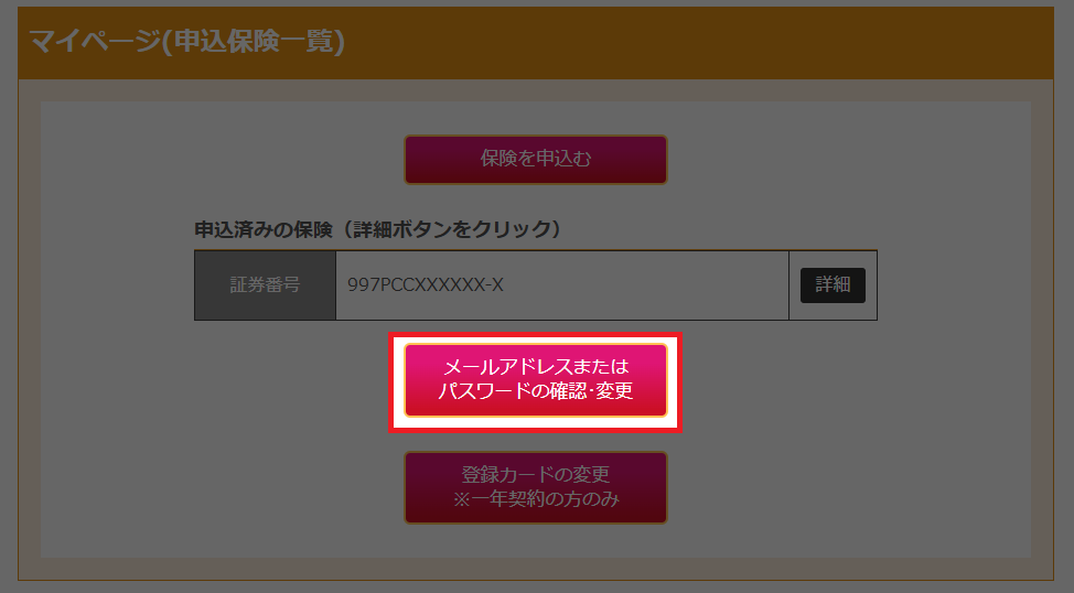 ログイン後、マイページ(申込保険一覧)画面の下より、メールアドレスまたパスワードの確認・変更ボタンをクリックします。